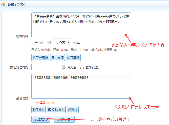 請注意!你注冊賬號成功后請聯(lián)系速碼云公司的銷售人員(也就是以后為你服務(wù)售后的客服)把你的賬號開通為開啟模式,然后你把你要免費測試的短信內(nèi)容編輯好給我們的銷售人員確定沒有問題后方可以發(fā)送短信。